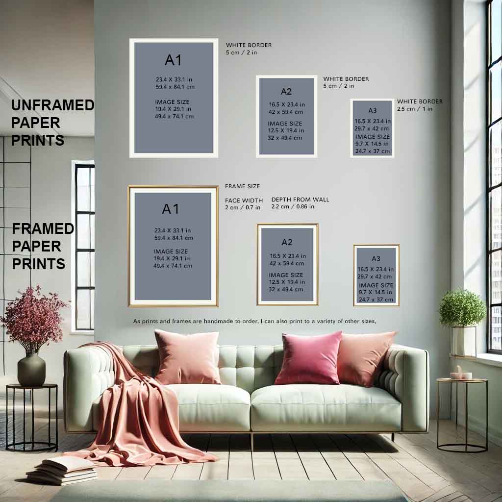 Framed and Unframed prints are available in three standard A sizes as follows: