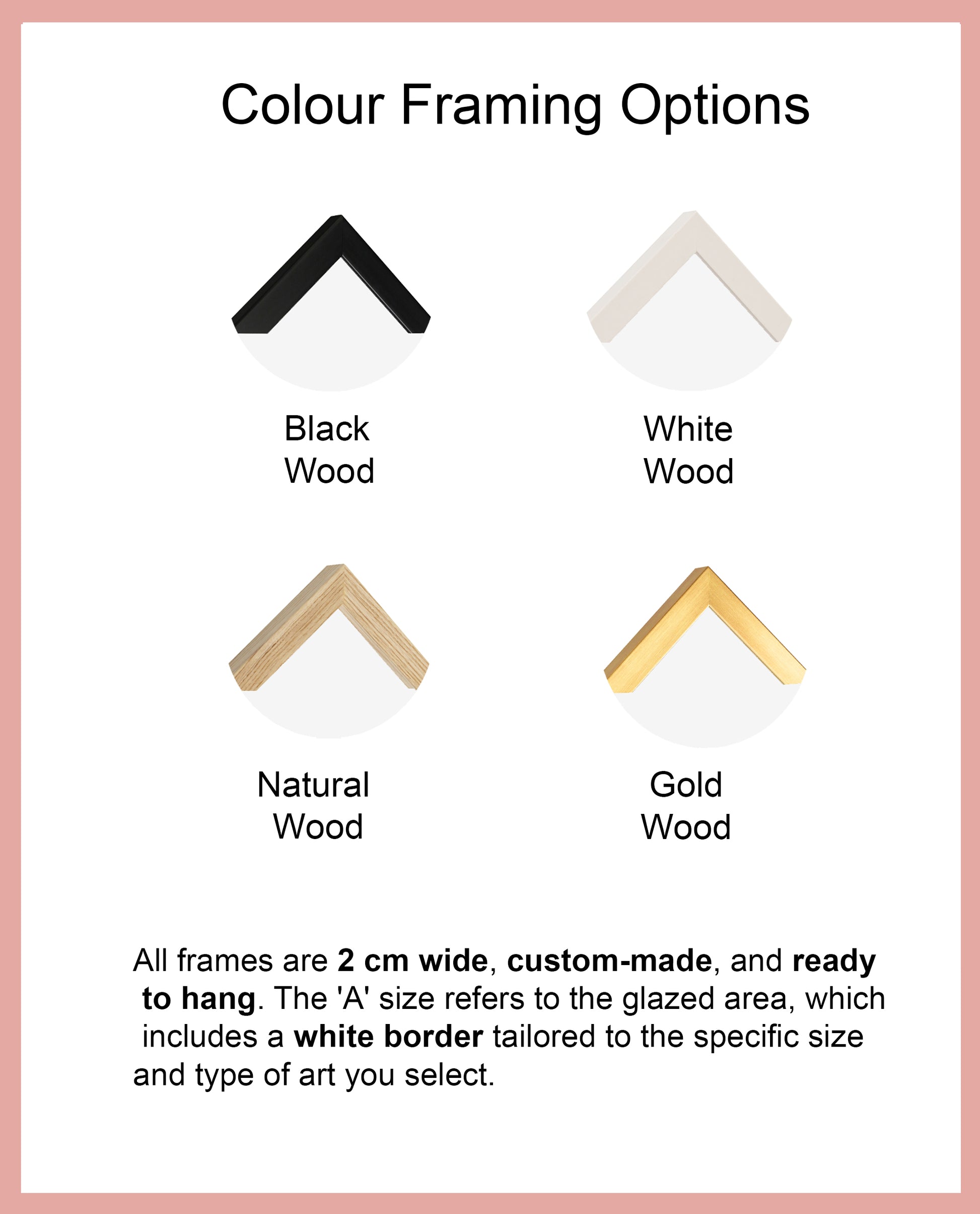 All framed prints are offered in Black and White. I have also chosen a Gold and Natural frame colour depending on what I think best suits the artwork, but if you have a specific colour in mind, please contact me and I'll see what I can do.